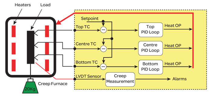 In a typical Eurotherm multi loop solution the master loop controls the temperature at the centre of the sample with two slave loops controlling the top and bottom zones. User wiring is employed to ensure the working setpoint for the master loop is also used by the slave loops. Temperature is measured by thermocouples attached to the samples. Heating control is most often via a solid state relay.
