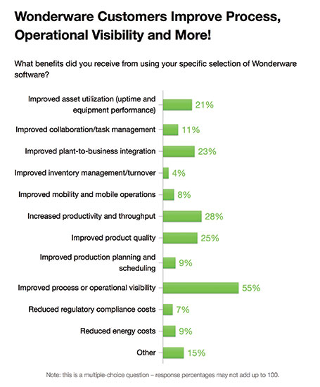 A Schneider-Electric Wonderware poll recently asked users to rate the benefits of using their particular selection of Wonderware. Most found improved process or operational visibility to be the most important, followed by increased productivity and throughput and improved product quality. Source: Survey of 278 users of Schneider-Electric Wonderware Manufacturing Operations software.