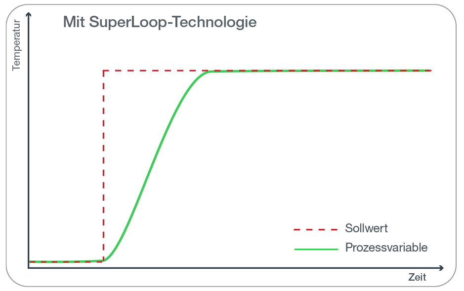 Die SuperLoop-Technologie sorgt für einen schnellen Anstieg auf den Sollwert mit minimaler Oszillation und überschwingen. Dies reduziert die Zeit, in der der Prozess nicht bei der optimalen Temperatur läuft, und erhöht die Auslastung der teuren Öfen, indem die Arbeitstemperatur so schnell wie möglich erreicht wird.