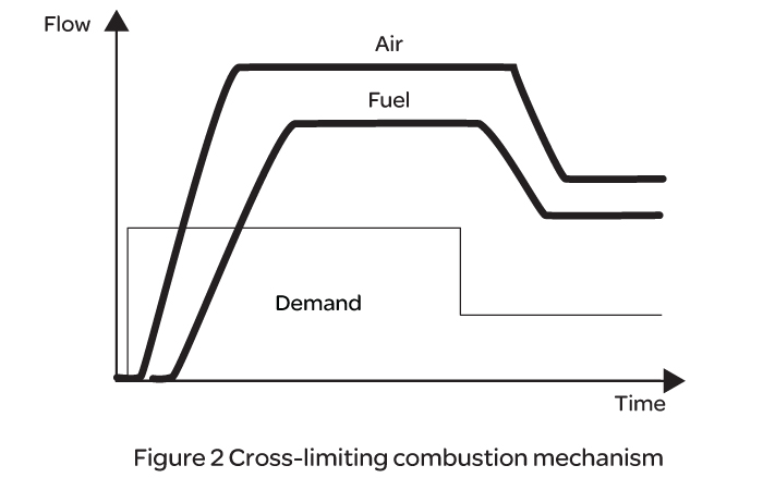 A cross-limiting combustion control strategy ensures that there can never be a dangerous ratio of air and fuel within a combustion process. This is implemented by always raising the air flow before allowing the fuel flow to increase or by lowering the fuel flow before allowing the air flow to drop.