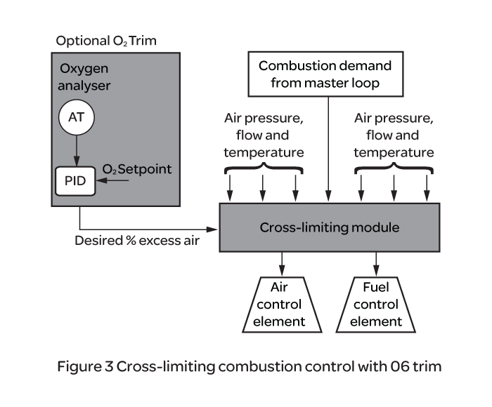 When a measurement of oxygen in the fuel gas is available, the combustion control mechanism can be vastly improved (since the percentage of oxygen in the flue is closely related to the amount of excess air) by adding an oxygen trim control module, enabling: