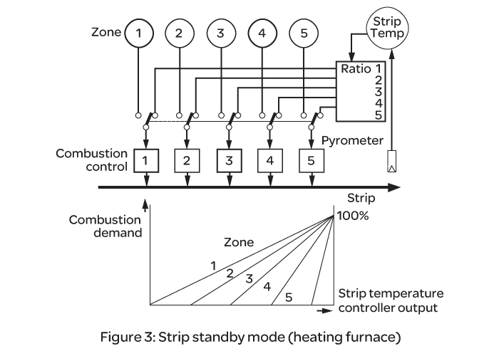 The control system, therefore, looks ahead and takes action at low line speed, line deceleration and line stop. These essential actions are to minimise the heating furnace firing and maintain atmosphere gas pressure due to the cooling strip.