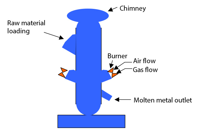 The furnaces produce molten metal from Pig Iron. Three burners with gas and air flow ratio control create the required temperature. The arrangement is illustrated below.