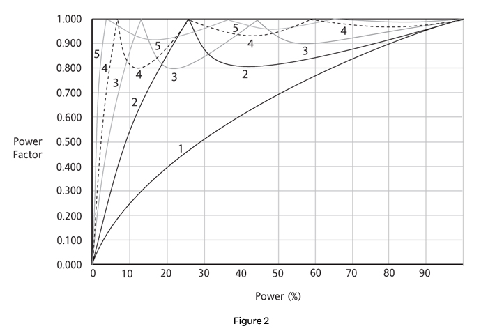 Figure 2 shows typical response from a 4. tap change control system. Notice how the power factor is above 0.9 for most tappings at the critical 50% demand level compared to the fundamental curve which shows 0.72 for 50% demand.