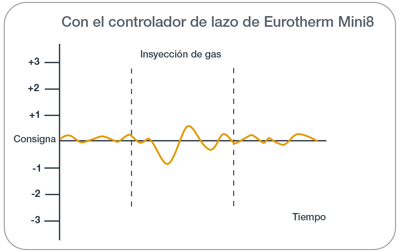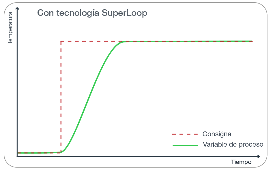 La tecnología SuperLoop permite alcanzar rápidamente el punto de consigna con una oscilación y un sobreimpulso mínimos. Esto reduce el tiempo que el proceso no está operando a la temperatura óptima, lo que aumenta la utilización de hornos costosos al lograr la temperatura de trabajo lo más rápido posible.