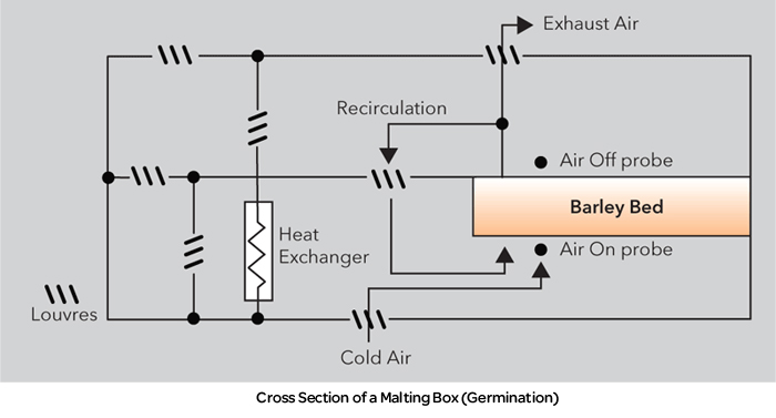 In germination both the temperature of the air blown onto the barley and the air taken off the barley are controlled. These temperatures are referred to as ‘Air On’ and ‘Air Off’.