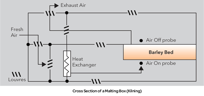 Temperature control is required during the germination and kilning stages. No temperature control is required during the steeping process. Heating is usually by gas or oil and smooth control is, therefore, achieved by controlling a motorised valve.
