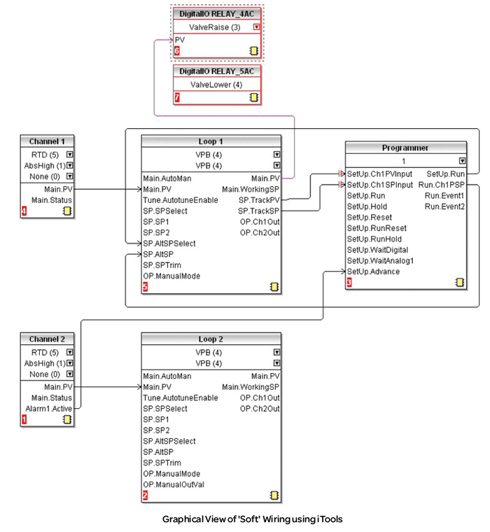 In this example Loop 1 controls the ‘Air On’ temperature using the programmer function block to increase the temperature in a series of steps. Loop 2 measures the ‘Air Off’ temperature and is used to advance the programmer to the next segment when the ‘Air Off’ temperature has reached the required setpoint. The alarm output is connected to the ‘Advance Segment’ input of the programmer function block. If more than one alarm is required these may be wired via a logic OR gate to the ‘Advance Segment’ input.