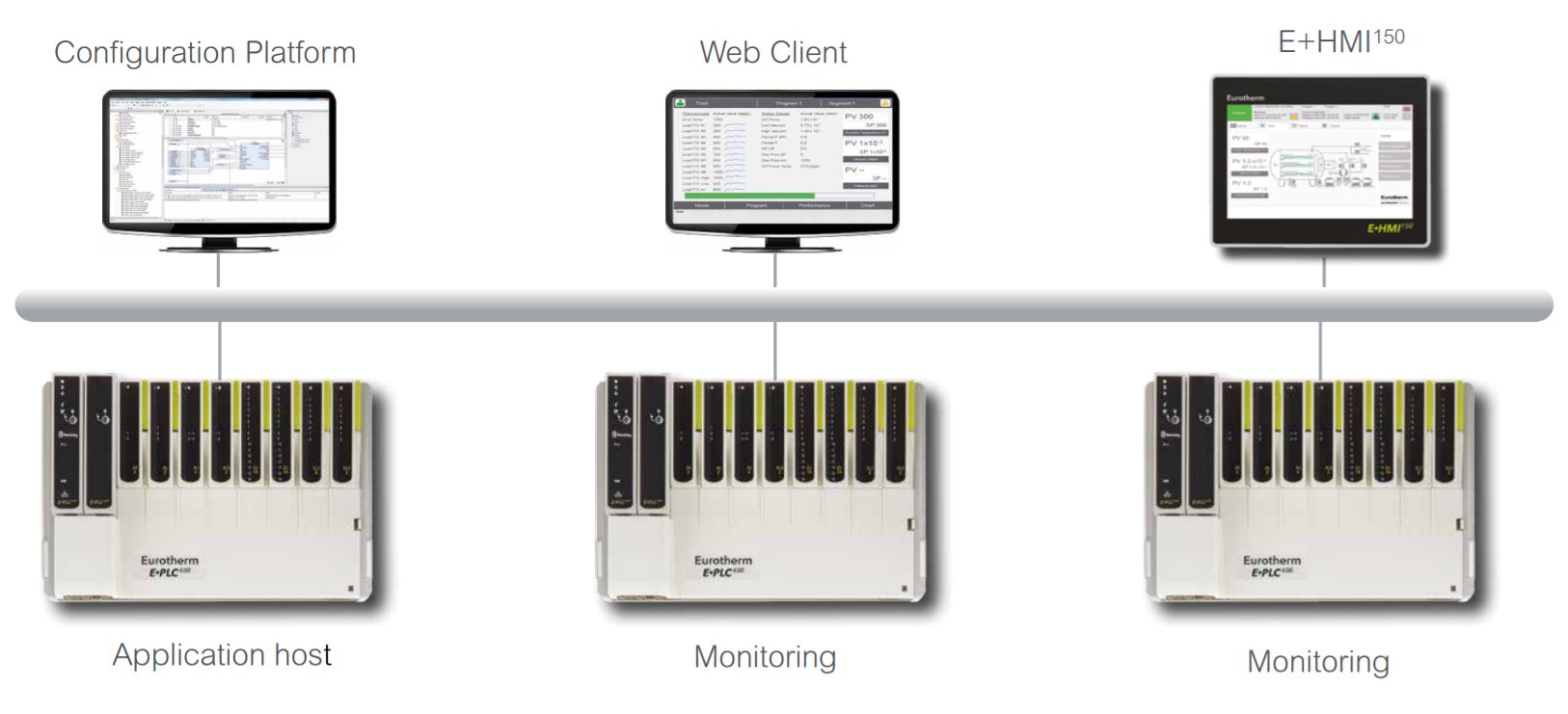 Multiple E+PLC400 Architecture with E+HMI150, Web Client and Configuration Platform