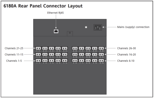 The 6000 TUS Recorder provides for the connection of up to 15 (30 channels for 6180A) Thermocouples sensors of any type (J, K, N, R, S, T etc). The sockets are arranged in three rows of 5, each row contains its own reference 4 wire Pt100 RTD sensor. Once installed and wired overall system calibration using the manufacturer’s instructions should be carried out prior to use.