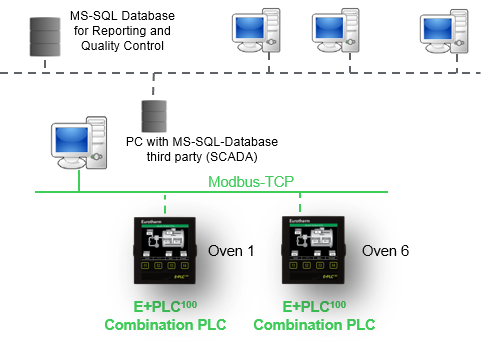 Project / Application: Oven controller refurbishment – replace six high maintenance oven controllers with E+PLC100 Combination PLCs that connect to third party (SCADA) & Production / Quality control system