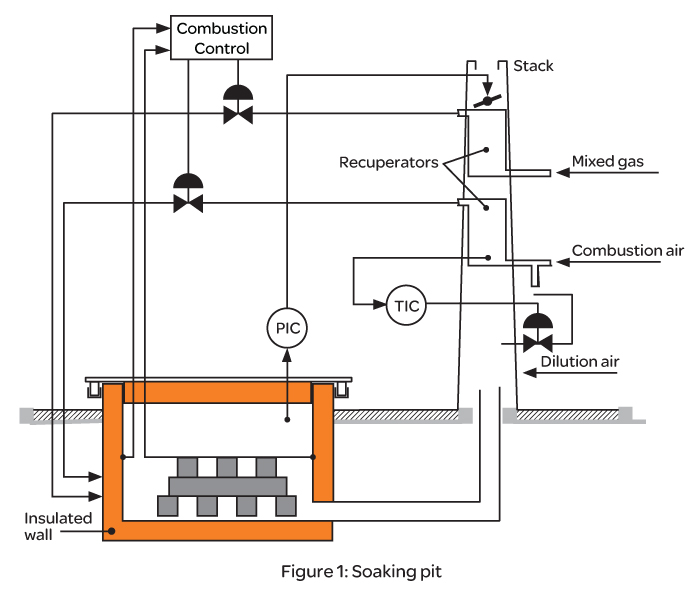 A soaking pit, see Figure 1, is a thermally insulated chamber with a top sliding lid to add or remove ingots. The pit is gas fired and therefore the continuous control requirements are temperature, gas flow, air flow and pit pressure. Further control could involve diluting the waste gas with air to maintain recuperator protection, and would include shutdown logic for over temperatures and low pressures.