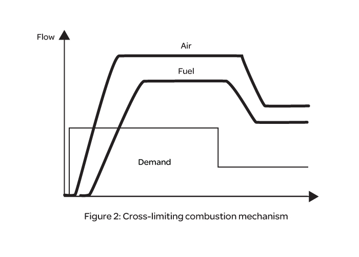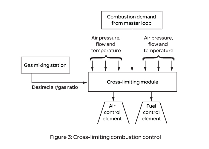A cross-limiting combustion control technique ensures that there is always an efficient ratio of air and fuel within a combustion process. This is implemented by always raising the air flow before allowing the fuel flow to increase, as shown in Figure 2, or by lowering the fuel flow before allowing the air flow to decrease. A combination of high and low select modules is therefore used in the implementation.