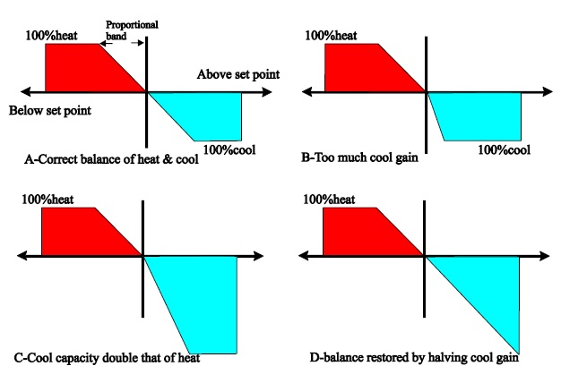 A shows a balanced heat/cool zone. B shows cool gain 2 times too large but maximum heat and cool capacities balanced C shows cool capacity twice that of the heater and cool gain in need of adjustment