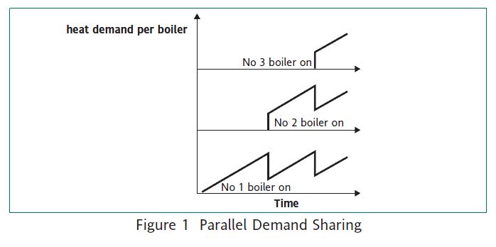 In parallel, the available boilers share the total demand simultaneously by taking up an equal firing rate to meet the load. On load increase, the firing rate of all modulating boilers will increase equally until the load requires an additional boiler. At this point, the firing rate of the active boilers decreases to compensate for the firing rate of the newly started boiler. Figure 1 explains the process for an increase of load.
