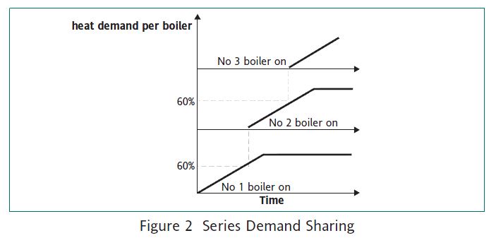Series demand sharing allocates loads by normally forcing one boiler at a time to modulate in order to satisfy the demand and is most effective when used with the Eurotherm demand schedule control module. On load increase, the firing rate of the modulating boiler will increase until the load requires an additional boiler. At this point, a new boiler is started and becomes the modulating boiler. The other active boilers are ramped to their optimum firing rate. Figure 2 explains the process for an increase of load.