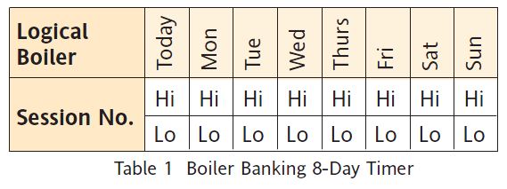 Further enhancement to the man machine interface is achieved by the 8-day timer facility depicted in Table 1. Boiler banking is tabulated according to daily upper and lower banking threshold pressures with an additional user definable ‘Today’ schedule to be loaded if and when required. Up to four optional session settings can be preconfigured and stored at the supervisory computer.