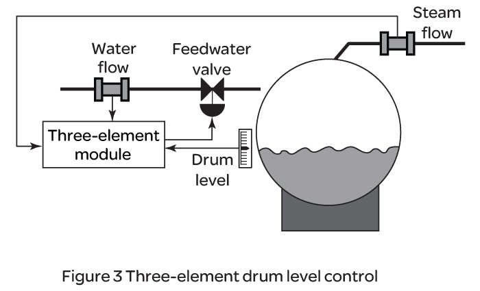 The three-element drum level control is ideally suited where a boiler plant consists of multiple boilers and multiple feedwater pumps or where the feedwater has variations in pressure or flow. The three-elements are made up of the following: